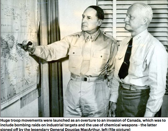 General Douglas MacArthur who subsequently led US forces in The Pacific during World War II, not to mention the conduct of the carpet bombing raids against North Korea (1950-1953) was actively involved in the planning of the invasion of Canada from 1930-1937. General MacArthur had been appointed U.S Army Chief of Staff in 1930.